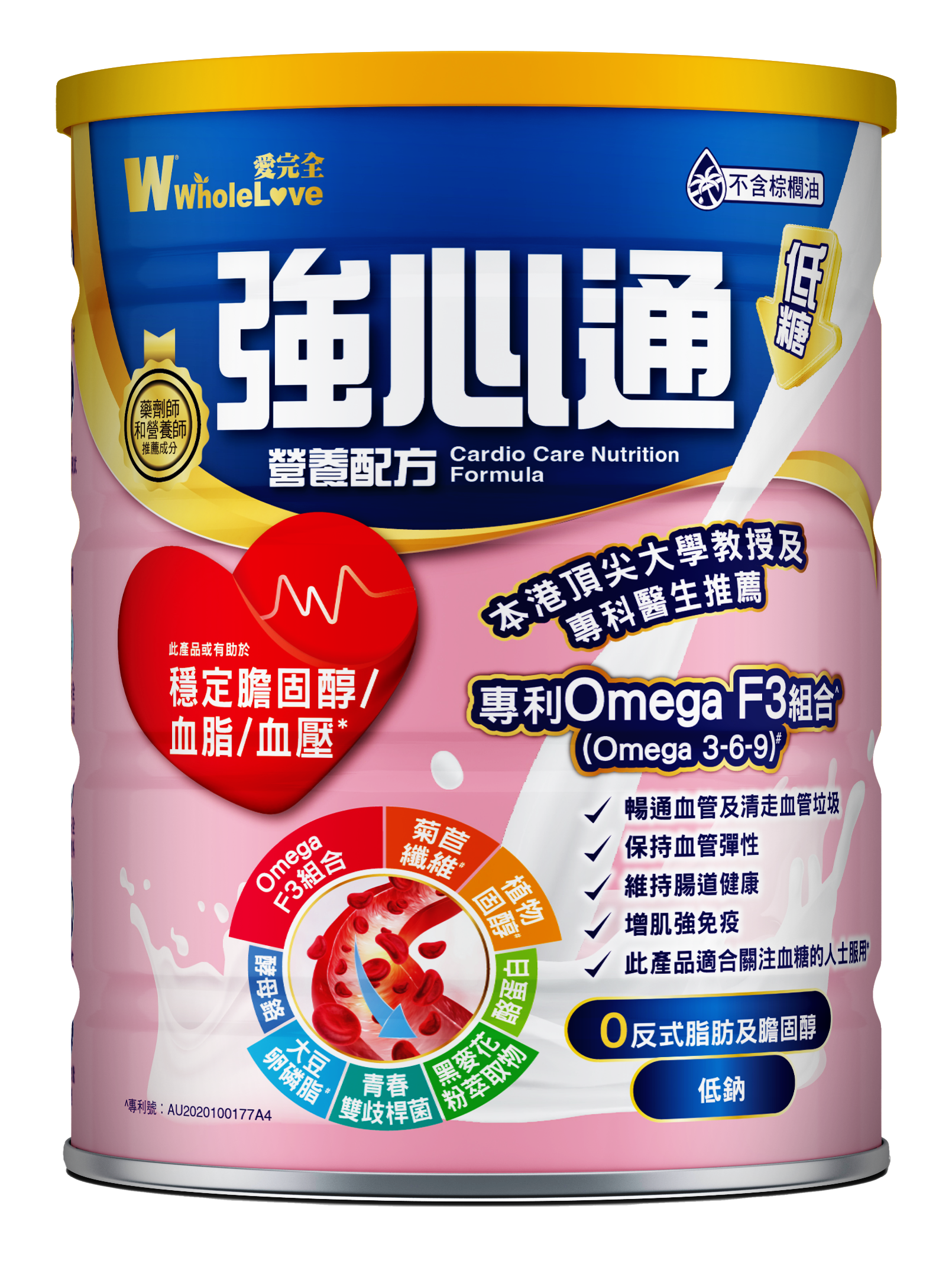 「愛完全 強心通營養配方」為本地頂尖大學教授及專科醫生推薦的營養配方,成分獲註冊藥劑師和營養師推薦,並獲95%用家認同有效降壞指數^,是專為三高人群設計的營養補充品。產品含有專利護心OmegaF3組合,此產品適合關注血脂/膽固醇/血壓/血糖的人士服用*