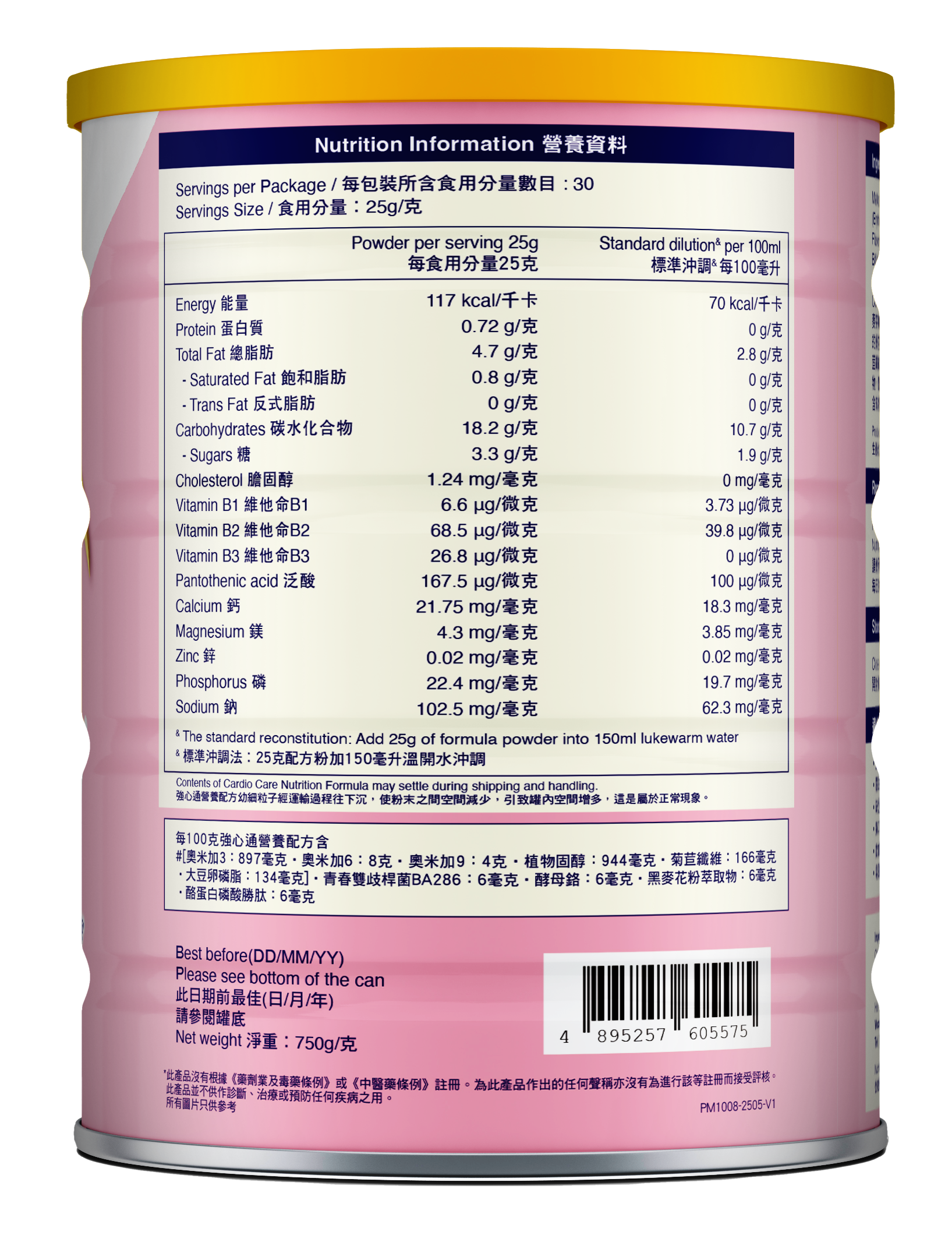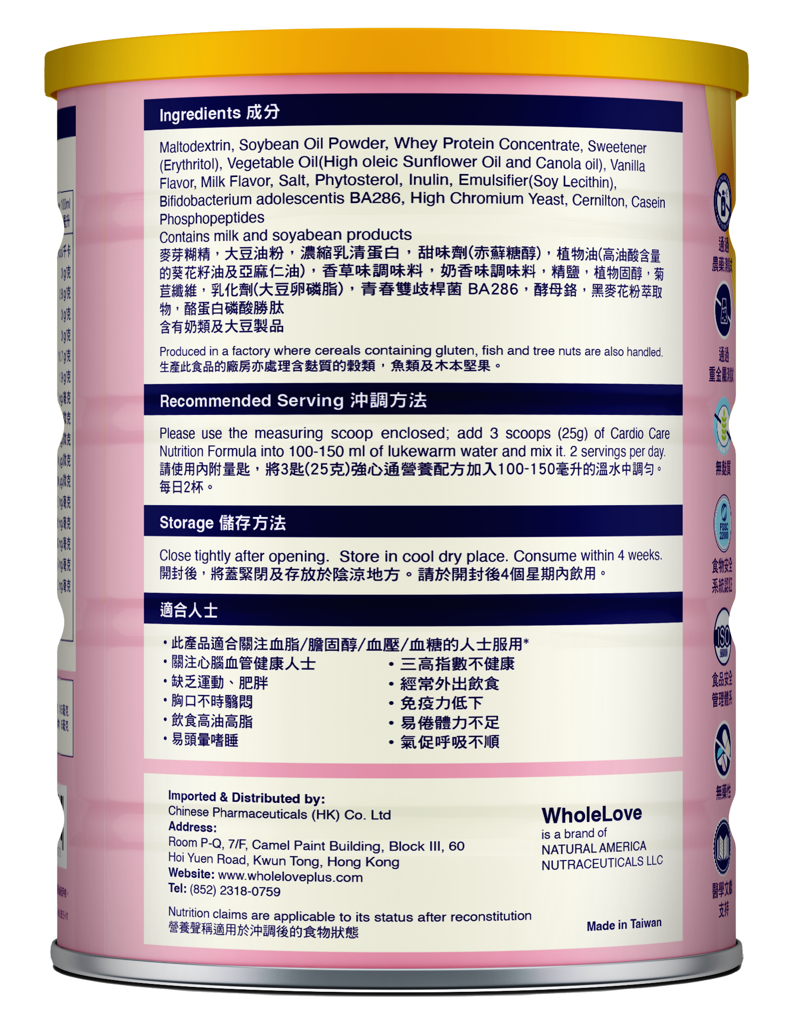 麥芽糊精, 大豆油粉, 濃縮乳清蛋白, 甜味劑(赤蘚糖醇), 植物油(高油酸含量的葵花籽油及亞麻仁油), 香草味調味料, 奶香味調味料, 精鹽, 植物固醇, 菊苣纖維, 乳化劑(大豆卵磷脂), 青春雙歧桿菌 BA286, 酵母鉻, 黑麥花粉萃取物, 酪蛋白磷酸勝肽